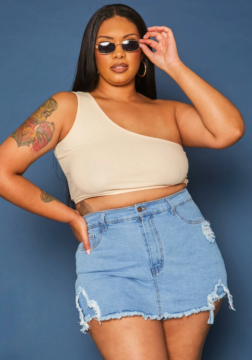 Asoph x Vibrant mini skort in light wash denim, high waist style, belt loop holes and pocket hem.
