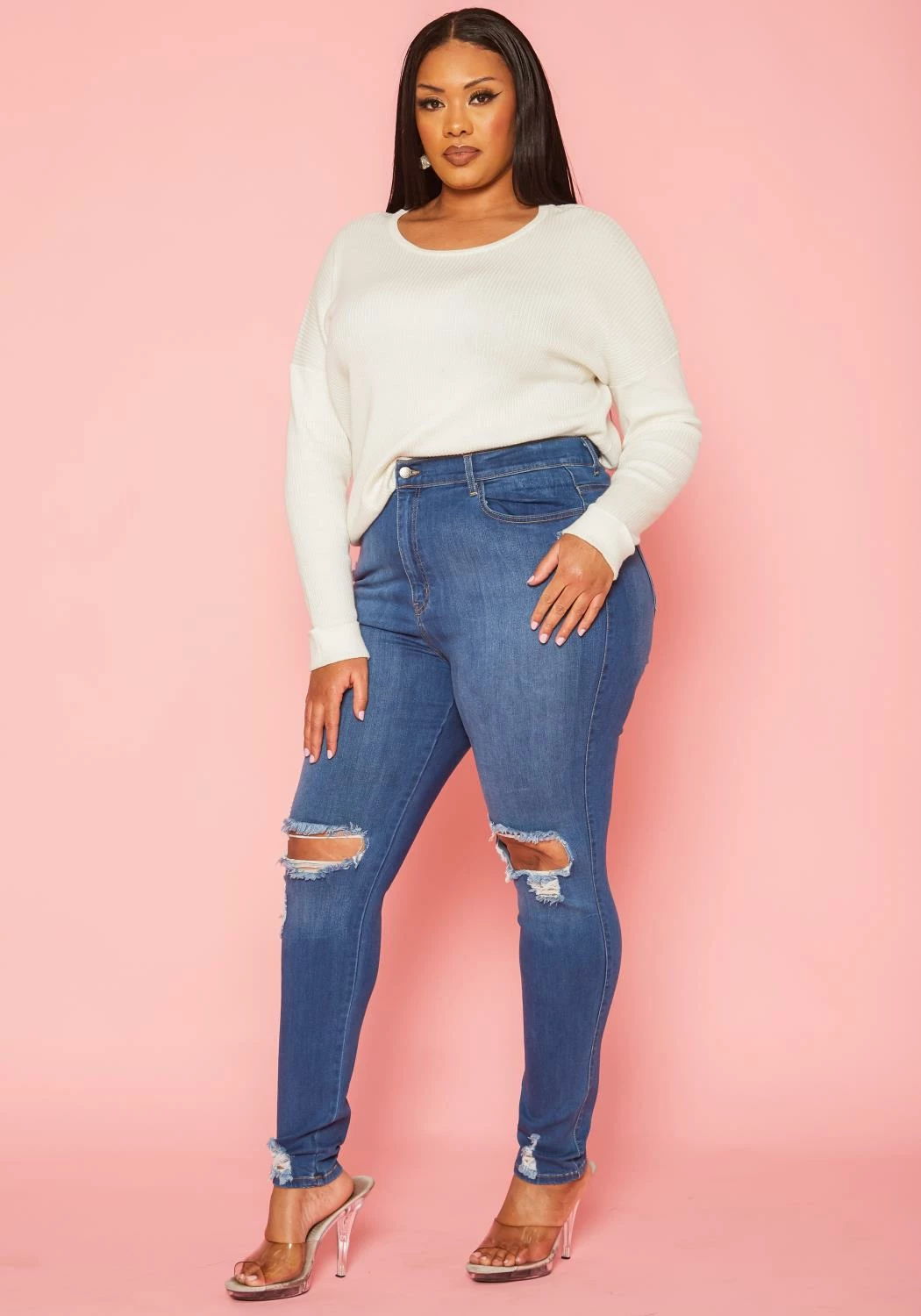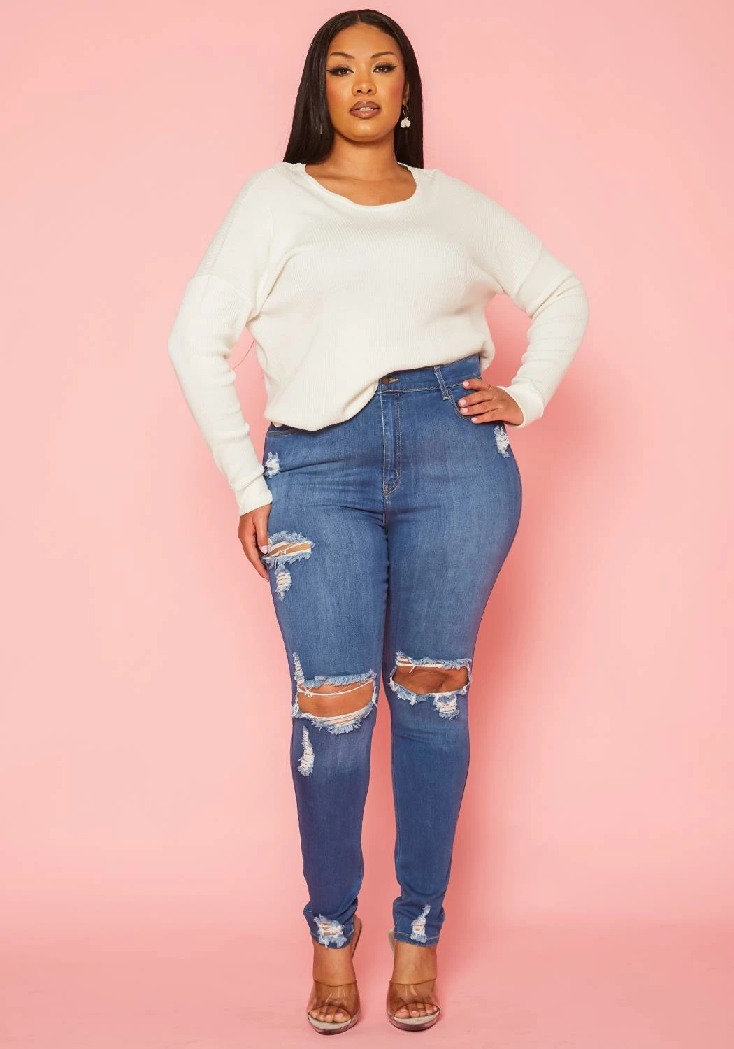 Asoph x Vibrant plus size women’s skinny denim jeans featuring multi distressed hem, belt loop holes, pockets and high waist style.