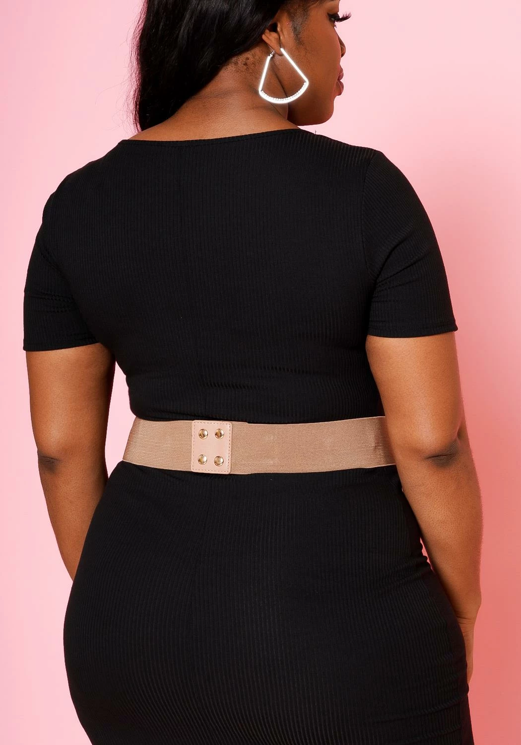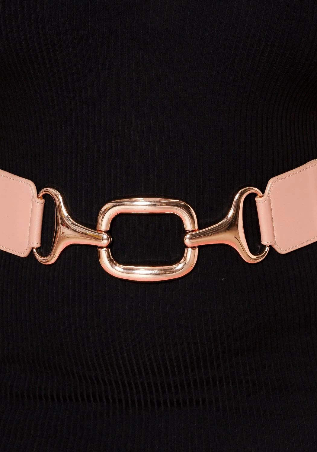Women’s belt, featuring a elastic band, gold square detail buckle & button hole closure.
